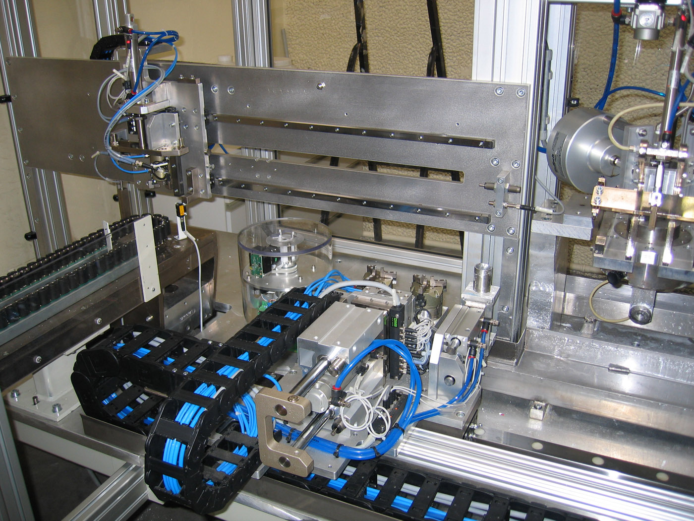 - A manipulator places empty cartridges in one of the seven stations, which fill the cartridges with a dosing pump and then compress the cartridge filling.